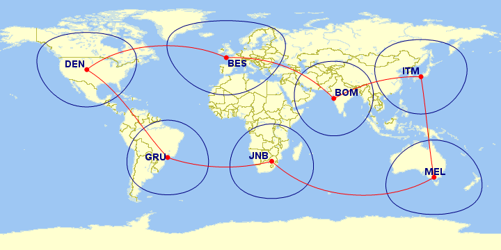 Alors que l'exploitation de notre 4ème HUB à Osaka n'en est qu'a ses débuts, Mark-Wiggins réfléchit déjà à la prochaine étape du développement de notre compagnie. Le choix est déjà réduit à 3 possibilités. Nous allons vous présenter ici les 3 prochains HUBs que nous ouvrirons. Ils nous permettront d'être présent sur tous les continents et de pouvoir créer une deuxième version du "Tour Du Monde par Moidrey Airways". La boucle en place en ce moment correspond plutôt à un "Tour du globe". Avec ces HUBs nous aurons une boucle qui fait le 'Tour du Monde' :